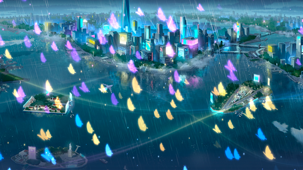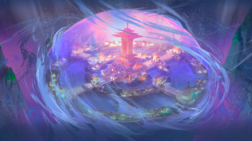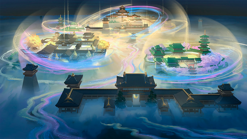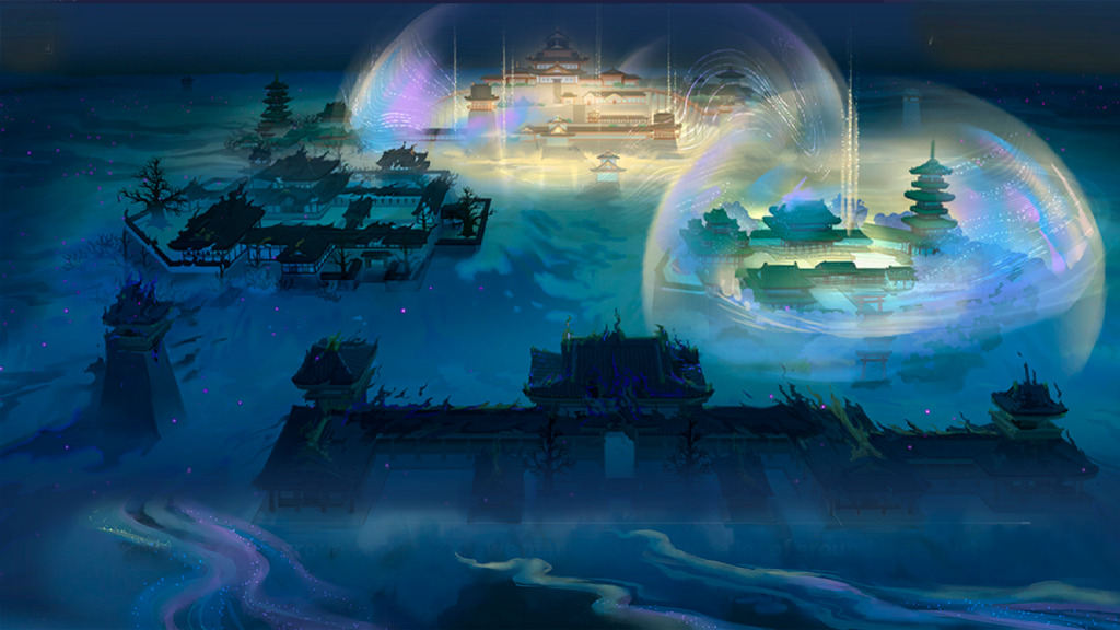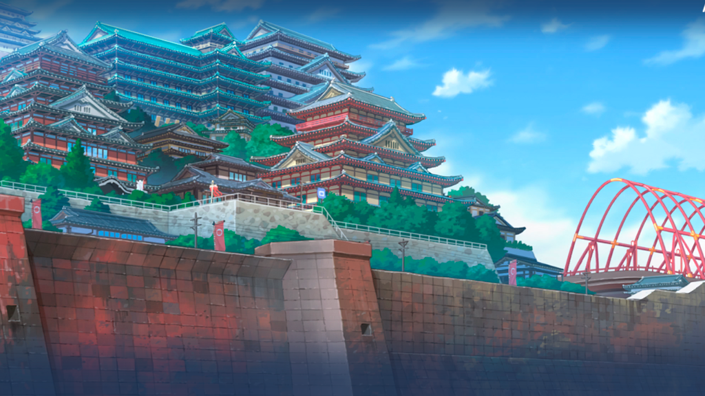 Дворец разделён двумя дорогами идущими с востока на запад, и с севера на юг, и разделён на три отдельные круглые зоны изнутри и снаружи. Каждая область не образует единого целого, а скорее разделяется на сектора разного размера из-за проходящих через них водных артерий. Здания, излучающие золотистый цвет, усеивают городской пейзаж, следуя правилам планировки: низкие снаружи и высокие внутри. Наконец, в самом центре его возвышается огромная башня, устремлённая ввысь над пейзажем и облаками. В файлах об Империи Сакуры, которые я читал, было название - Дворец Дракона. |