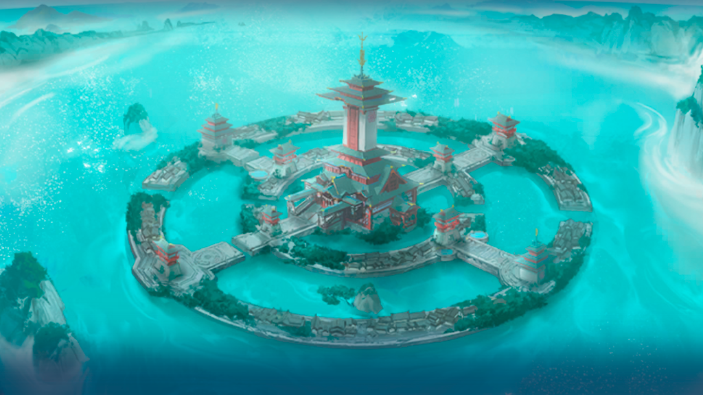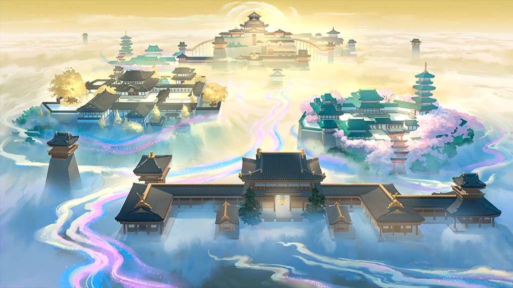 Неужели мы... только что вошли в Зеркальное море? Тут так красиво. Как будто находишься внутри изображения на свитке из Империи Сакуры. Дворец, состоящий из древних зданий, безмолвно возвышается над поверхностью моря. |