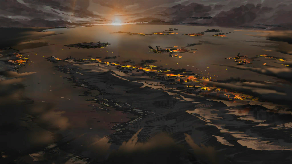 Небо затянутое тучами, заслонил рой бесчисленных беспилотных летательных аппаратов, и вскоре после этого в их поле зрения появился флот боевых кораблей. Поднятый по тревоге взрывом, произошедшим всего несколько мгновений назад, флот перестроился в боевую формацию. |