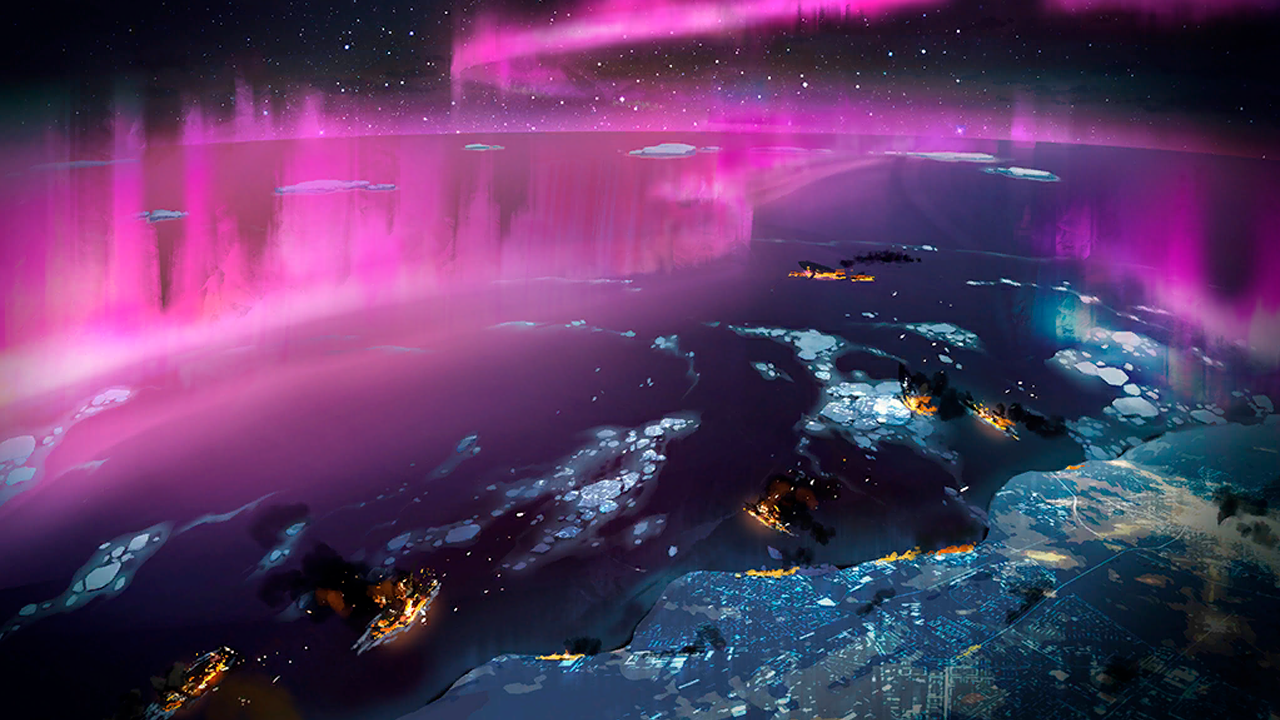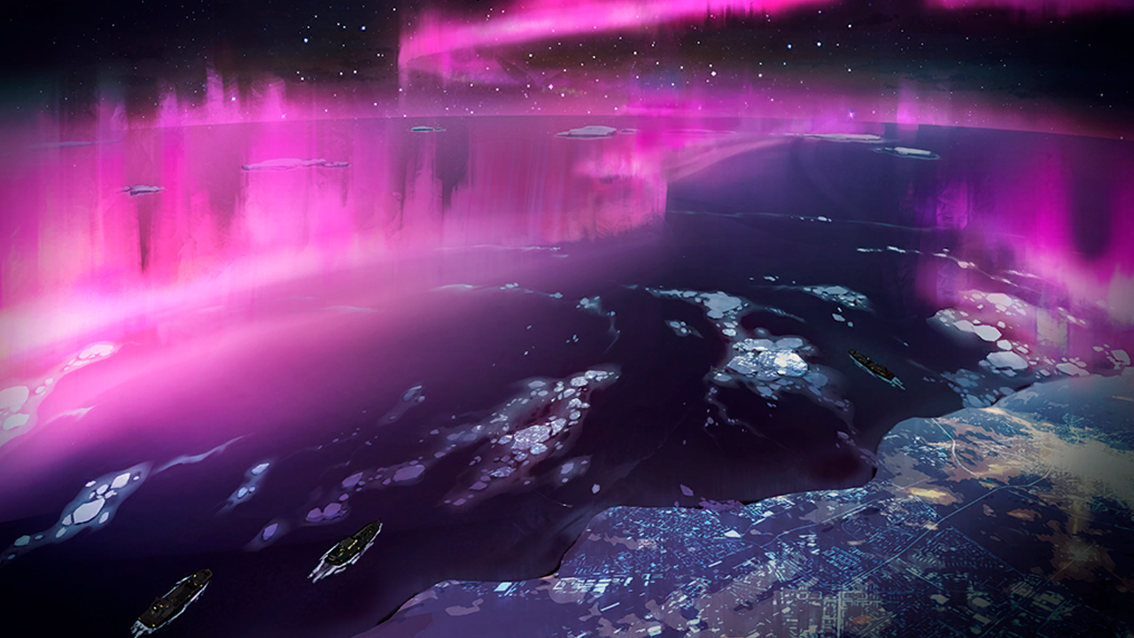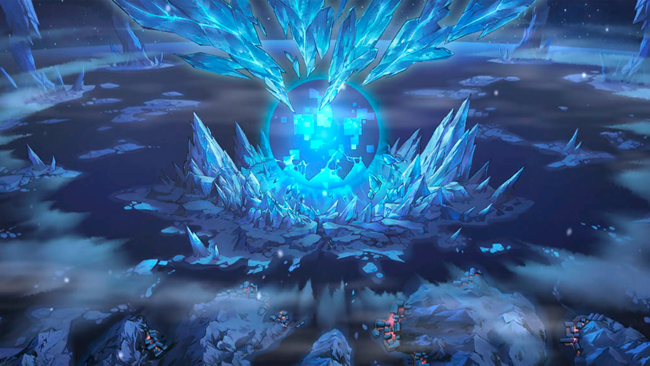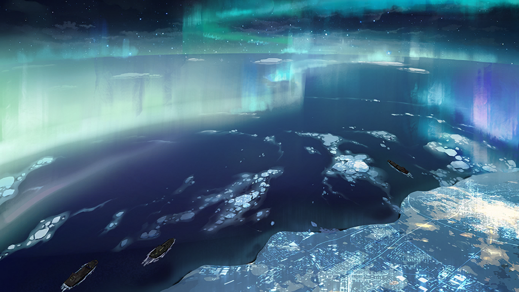 | Бесчисленные ледяные столбы, будто ведомые колоссальной силой, неестественно сплетались воедино, устремляясь от поверхности моря к небесам и изгибаясь в причудливую гигантскую структуру. Это было место, ставшее внешним оплотом полярных Сирен — «Корона», первая аномалия, некогда открытая силами «Пепла». Со стороны «Короны» бесконечные орды Сирен приближались, поглощая морскую гладь, словно само воплощение конца света. |